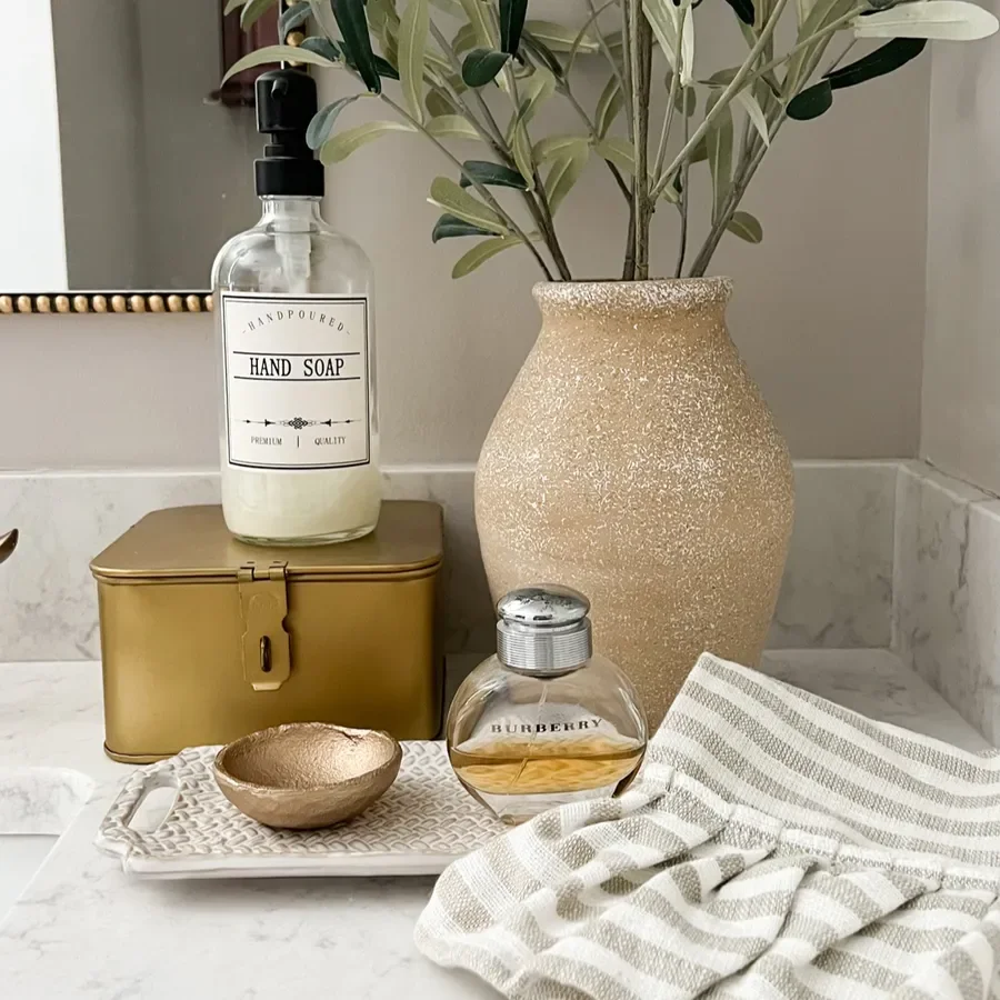 I know these are your standard organizational hacks BUT they sure do make your bathroom feel warm and a comfortable place to get ready! I love to add in real or faux plants for a pop of greenery! I like to use runners or non-traditional bathmats to add in an extra interest , and finally little decor items that can also be functional such as vases, tissue covers and interesting towel racks!