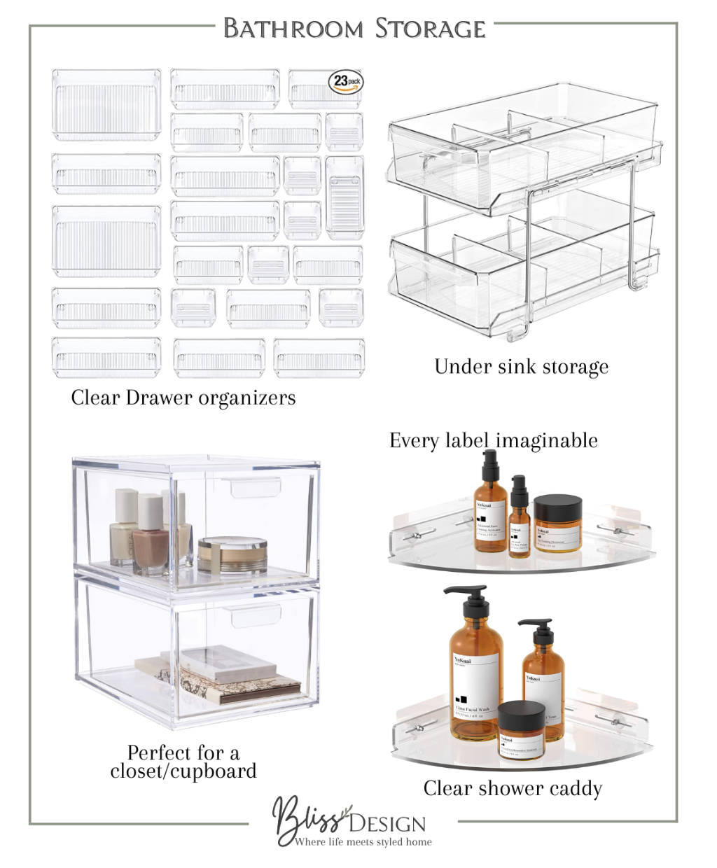 I highly recommend using clear containers and organizers in cabinets, drawers and vanities. Having clear containers allows you to see all the items you need quickly and efficiently. I have these drawer organizers and they are perfect for make up, tooth brushes, hair accessories etc. See all my favorites here!